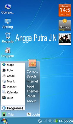 Mungkin beberapa dari kalian yang tidak tahu launcher windows Xp dan windows 7 untuk ANDROID ,jadi yang sudah tahu ikut nyimak aja ya ^_^. Kalo kalian bosan dengan tampilan android gitu2 aja ,,kalian bisa mencoba launcher windows7 yang satu ini,tampilan hampir mirip dengan desktop windows7 pada umumnya ,dan hebatnya lagi jika kita bosan dengan tampilan windows di android, kalian bisa download themes yang tersedia di start menu ,ada banyak themes tersedia termasuk WINDOWS XP,WINDOWS VISTA dan WINDOWS 8 ,,keren kan :D hehehe..